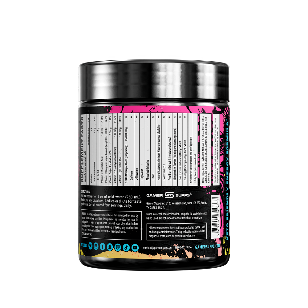 GG is the ultimate energy and focus formula designed to Level Up Your Gaming. The highest quality ingredients make up an energy formula that mixes completely and provides a healthier and more cost effective energy drink.